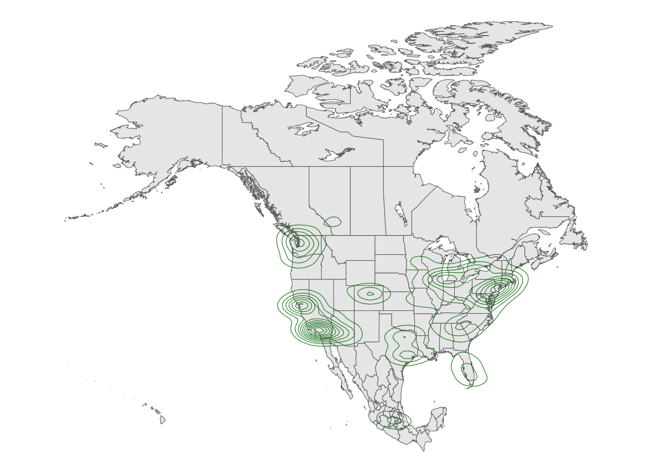 example: bigfoot sightingsContour Maps: plotting the density or distribution of observations (not the individual observations themselves)