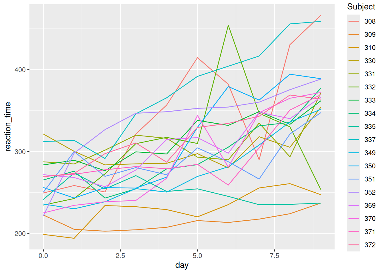 Reaction time increases (worsens) with a lack of sleep. Some subjects seem to be more impacted than others by lack of sleep, and some tend to have faster/slower reaction times in general.